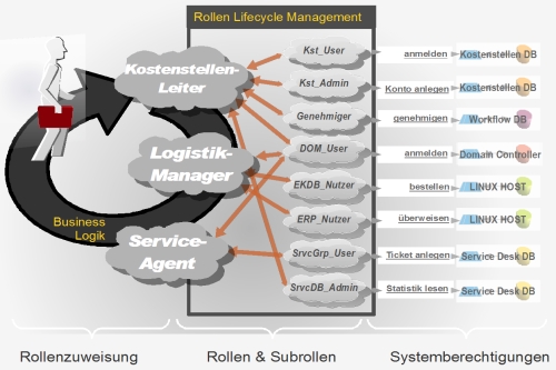 Durch Kombination von Rollendefinitionen auf funktionaler Ebene (Systemberechtigungen) mit denen auf der Ebene von Geschäftsprozessen (Business-Logik) kann die komplette Rollenzuweisung eng mit operativen Aufgaben verknüpft und mittels Automatismen optimiert werden.